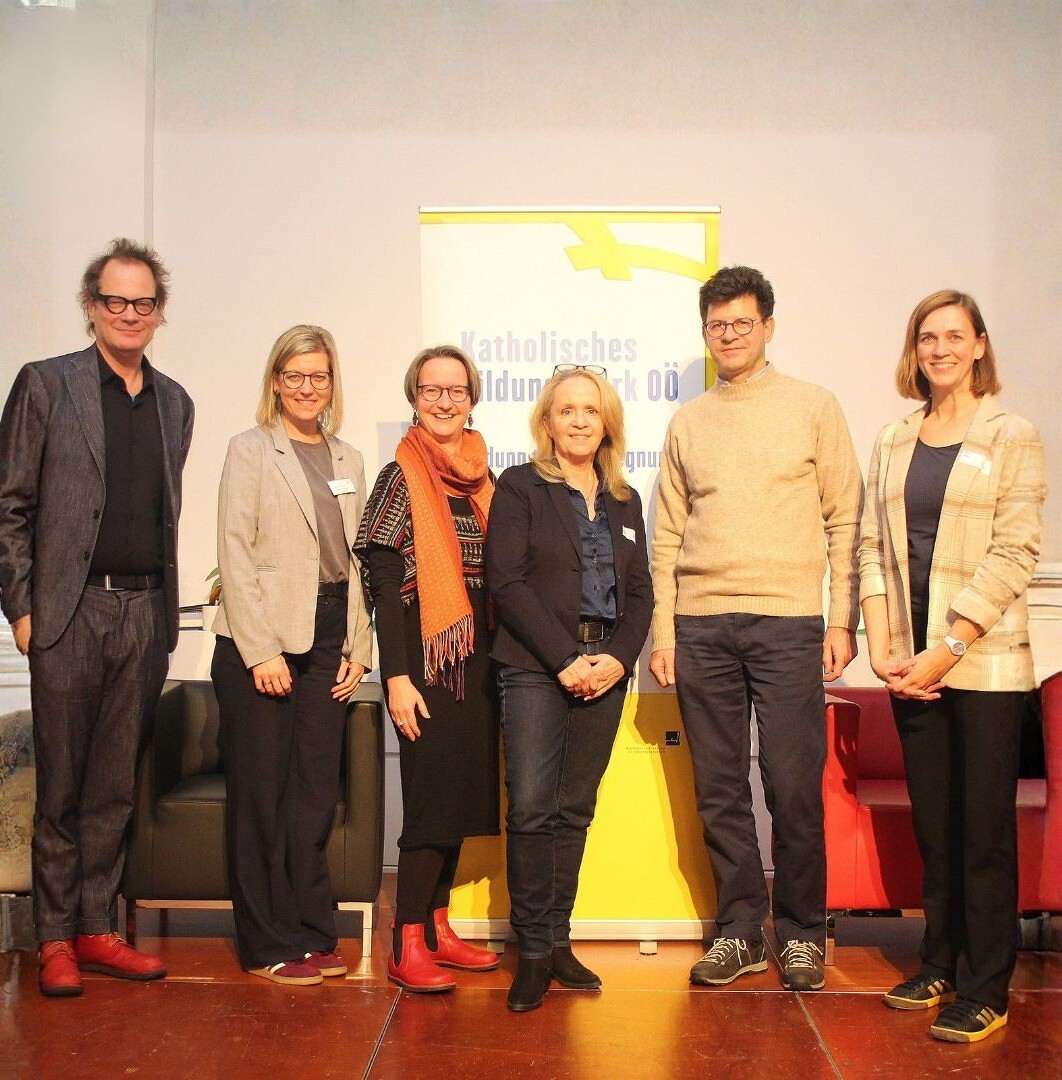 v.l.: Geschäftsführer Michael Münzner, Autor, Seelsorger und Psychotherapeut Arnold Mettnitzer, Elisabeth Birnbaum, Thomas Vogler, Shopleiterin Maria Imlinger und Bischof Manfred Scheuer.