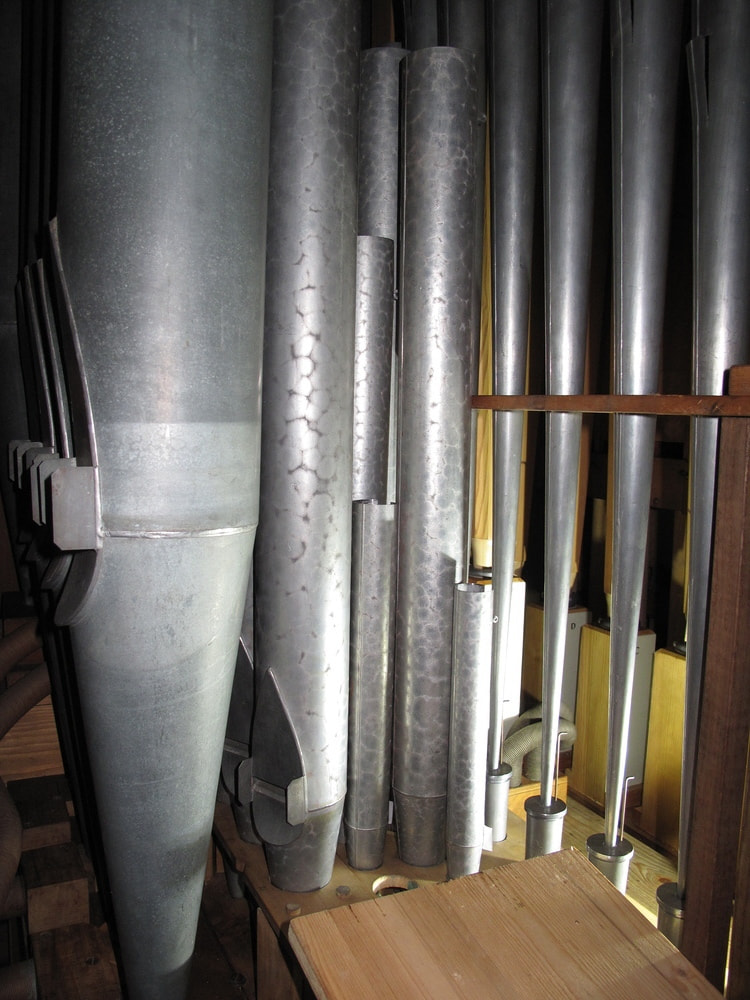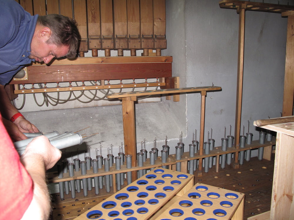 ... und dem Einlassen des Gehäuses wollen auch die Pfeifen nach dem rundieren und richten wieder den gewohnten Platz einnehmen. So einfach ist es nicht, es muss intoniert und vorgestimmt werden. Manch akrobatischer Akt ist notwendig um die Pfeifen zu erreichen. Sowohl Zungen- und Labialpfeifen ließen sich 2 mal bitten um den richtigen Klang zu erzeugen!