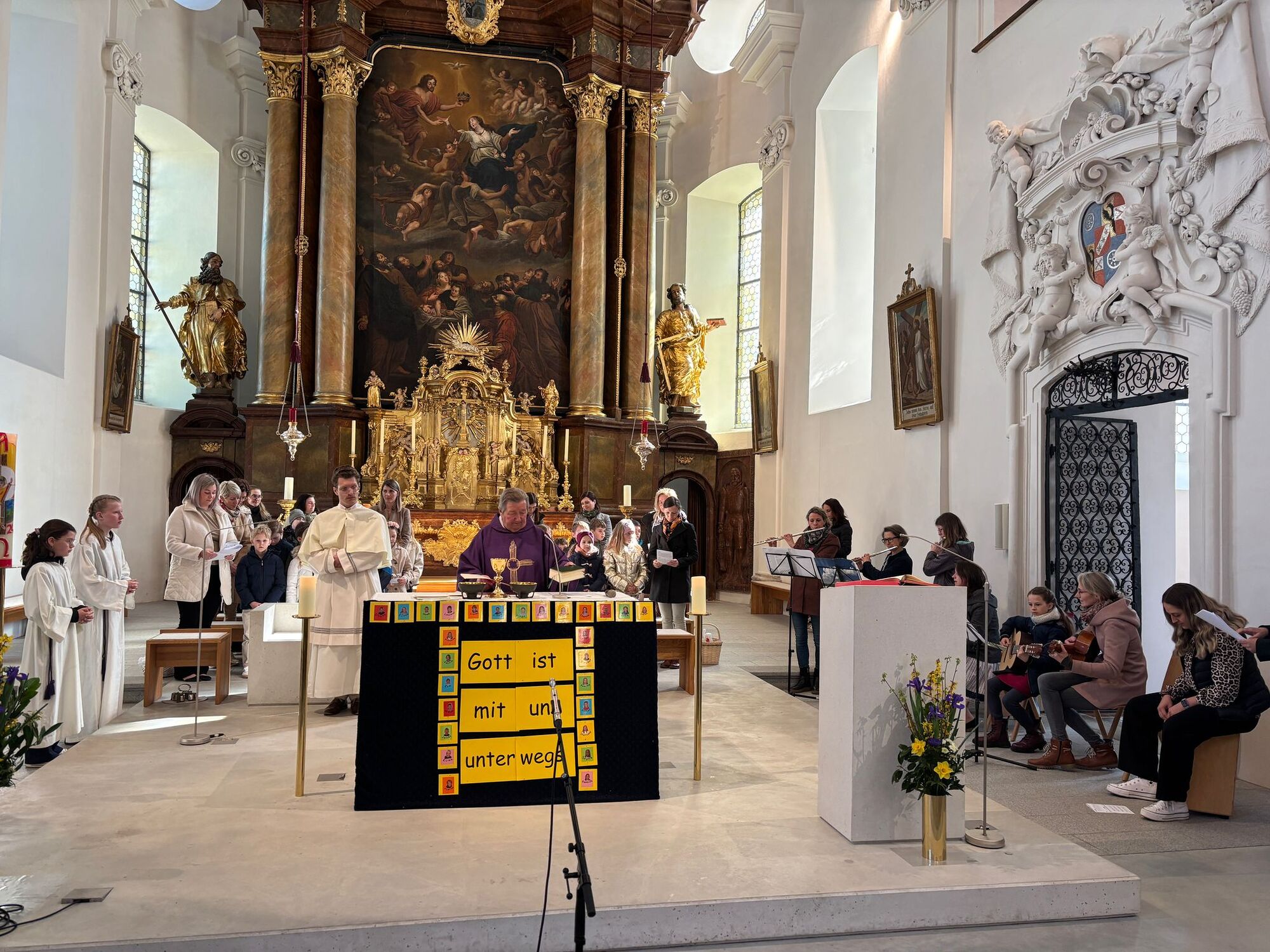 Am 6. April gestalteten die Kinder, welche am 29. Mai die Erstkommunion empfangen werden, mit den Tischeltern, den ReligionslehrerInnen und Musikern, den Gottesdienst. Er stand unter dem Motto: Gott ist mit uns unterwegs.