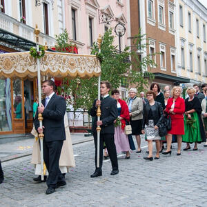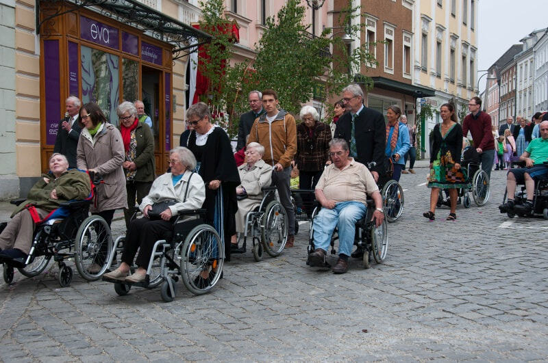 Der Fachausschuss Caritas der Pfarre Eferding ermöglichte heuer zum ersten Mal Bewohnerinnen und Bewohnern des Seniorenheimes Eferding, an der Fronleichnamsprozession teilzunehmen, bei der Fronleichnamsprozession "mitzugehen".